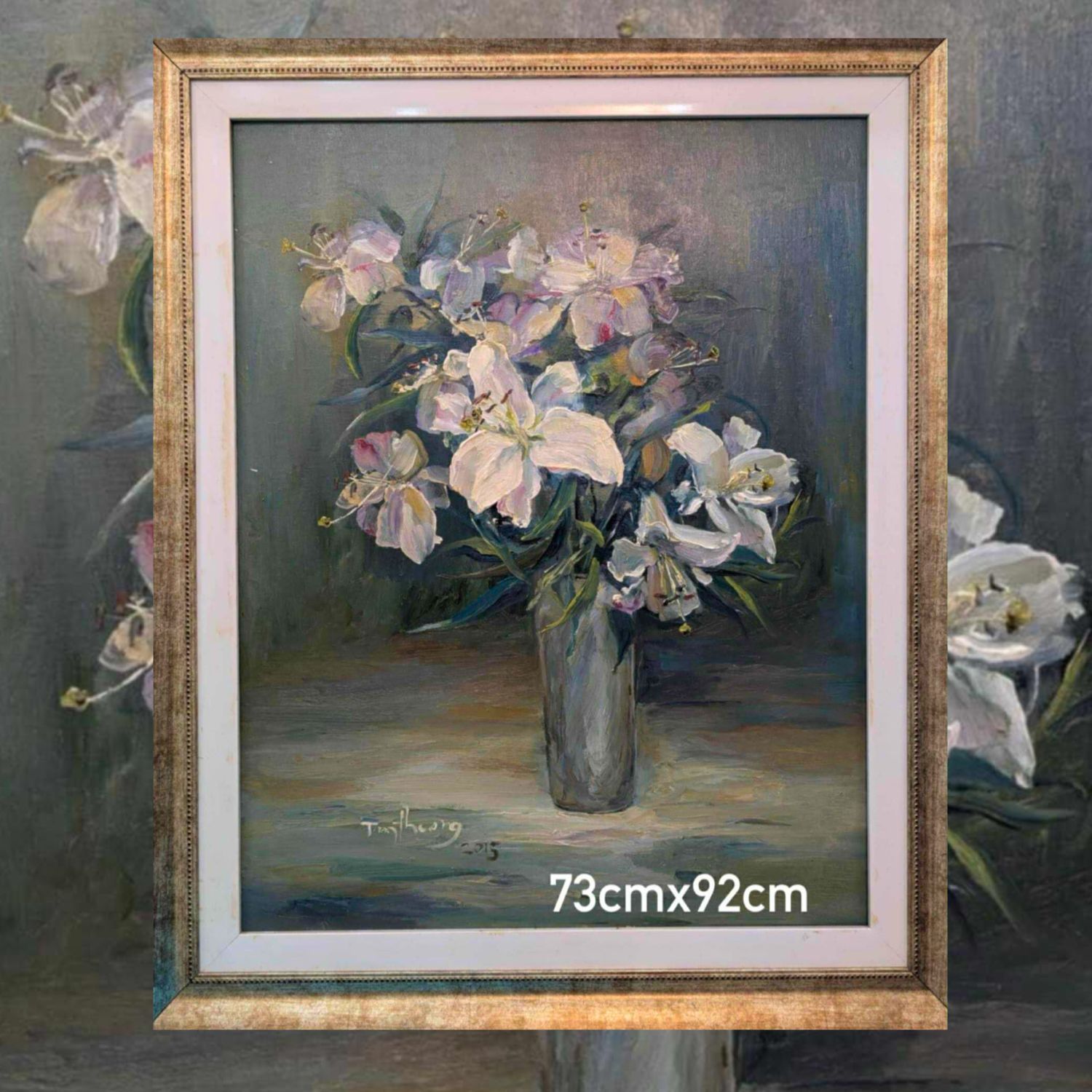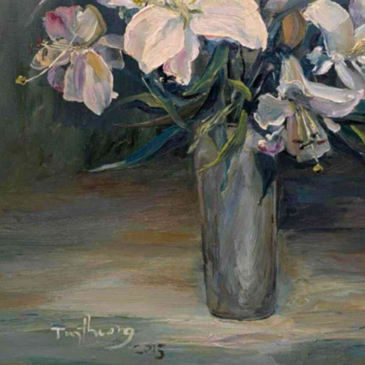 • Colors: Pure white flowers with pale yellow stamens, green leaves. Silver-grey vase. Soft blue-grey background.